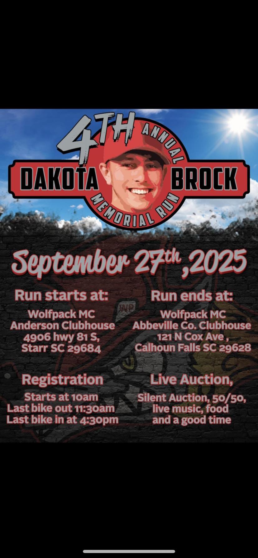 4th Annual Dakota Brock Memorial Run + Add to Google Calendar + iCal / Outlook export Date Sep 27 2025 Expired! Time 10:00 am - 6:00 pm Location Wolfpack MC Anderson Clubhouse 4906 Hwy 81 S. Starr, SC 29684 Category SC Event Share this event